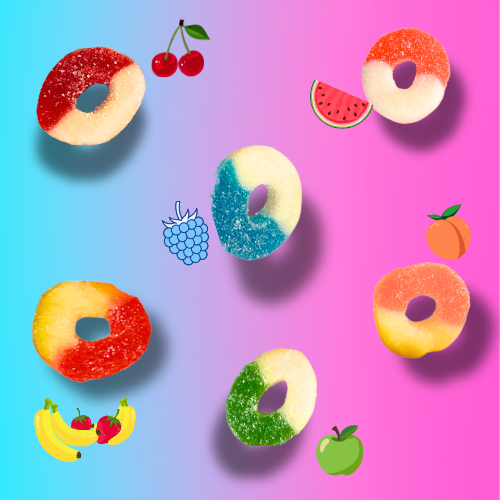 Dive into a bold burst of flavor with Ringies, our irresistible gummy ring mix. Experience the daring blend of watermelon, peach, green apple, blue raspberry, cherry, and strawberry banana, each bite delivering an exciting twist. Perfect for those who crave a vibrant, playful treat that sparks your taste buds and keeps you coming back for more. Get ready to snack boldly with Ringies!